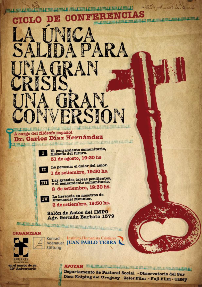 El Centro de Estudio y Difusión de la Doctrina Social Cristiana (CEDIDOSC) y el Instituto Humanista Cristiano Juan Pablo Terra con el apoyo de la Fundación Konrad Adenauer organizaron un Ciclo de Conferencias que el filósofo y conferencista español Dr. Carlos Díaz Hernández, dictó los días 31 de agosto, 1,2 y 3 de septiembre en la Sala de Eventos del IMPO (Germán Barbato 2379, 2º P), bajo el título: «La única salida para una gran crisis, una gran conversión».
